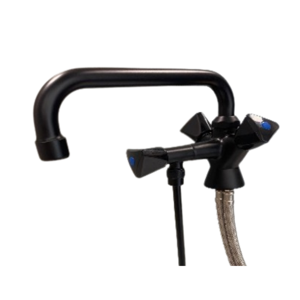 Moderne hoogglans zwarte mengkraan met zwenkarm. Ideaal voor trendy bars of industriële interieurs.